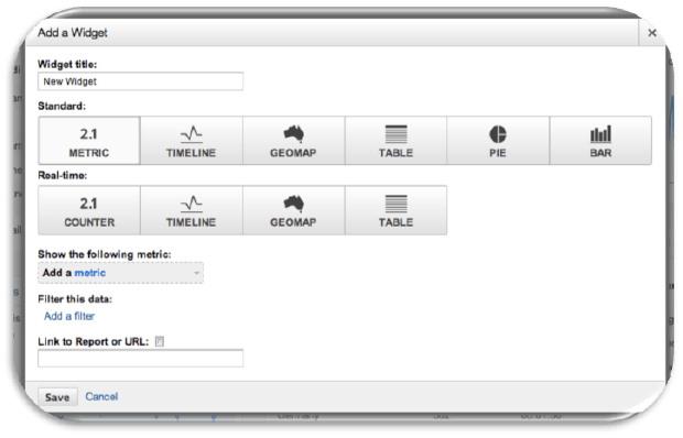 Dashboards are also a great tool to quickly monitor your business KPIs and online marketing efforts. With Google Analytics, you can build up to 20 dashboards per profile with up to 12 widgets per dashboard. This month, Google Analytics launched Real Time Widgets, so now widgets that are part of your dashboard can have real time information.