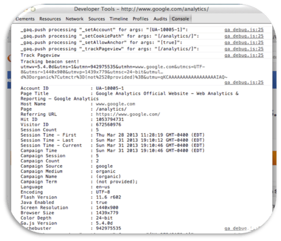 The console tab will show you what information is being sent to Google Analytics once someone hits a specific page on your website. Therefore, this tool provides a quick and reliable way to test Google Analytics implementations without having to wait for the data to appear on the Google Analytics user interface.