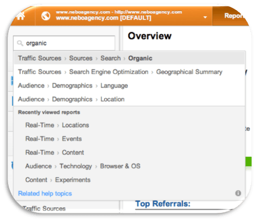 To save time (if you need to get to the Organic traffic report, for example), instead of going to Traffic Sources-> Sources-> Search-> Organic, you can simply use the search box located at the top of the left navigation bar to quickly access this report. By clicking on the search box, Google will also display a list of recently viewed reports.