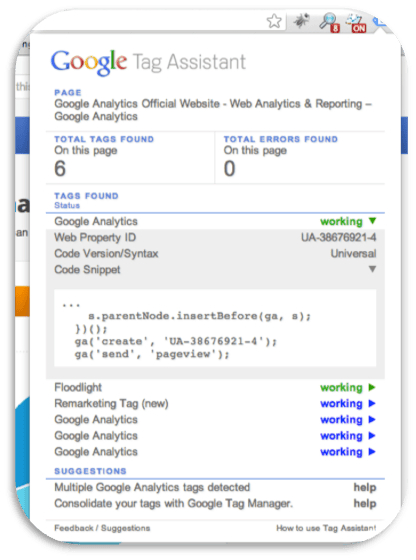 This tool will save you time as it lets you know the Google Analytics, Google AdWords (conversion and remarketing tags), Google Tag Manager and DoubleClick Floodlight tags that the page has. It will also evaluate each tag and determine if it is working (coded as green), if the tag can be improved and how (coded as blue), if there are minor or critical implementation issues with the tag (yellow and red respectively), or if there are no tags on the page (the Google Assistant icon appears grey and displays an X).