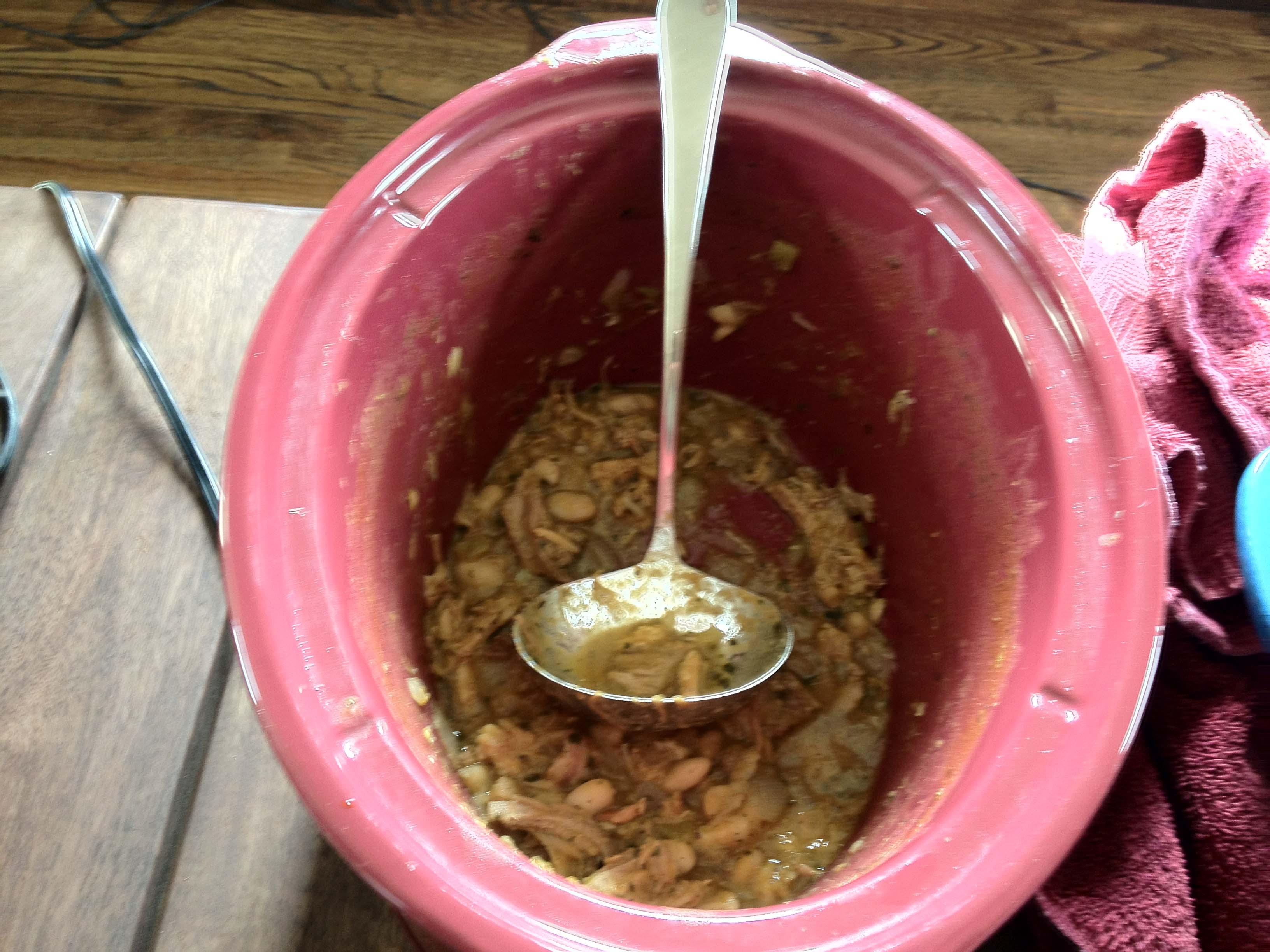 Saute 1 onion with a wallop of butter. When the onions turn translucent, add 2 lbs of leftover pork - taking care to choose good pieces. Also throw in a few cloves of minced garlic. Stir around for just a bit to get the meat juices flowing again, and then add 2.5 cups of mushroom broth, 8 ounces of diced green chiles, 4 teaspoon ground cumin, 2 teaspoon dried oregano, 2 teaspoon cilantro, 1/2 teaspoon cayenne pepper, 1 15 ounce can of cannellini beans (do not drain). Crucially, submerge large hunks (0.5 lbs) of leftover pig skin and gristle in the chili. Bring to a simmer, then reduce heat a tad and let sit for 45 minutes uncovered. Add cover for last 15 minutes. Remove pig skin. Stick in fridge over night. Reheat and add Monterrey Jack and diced green onions for garnish.