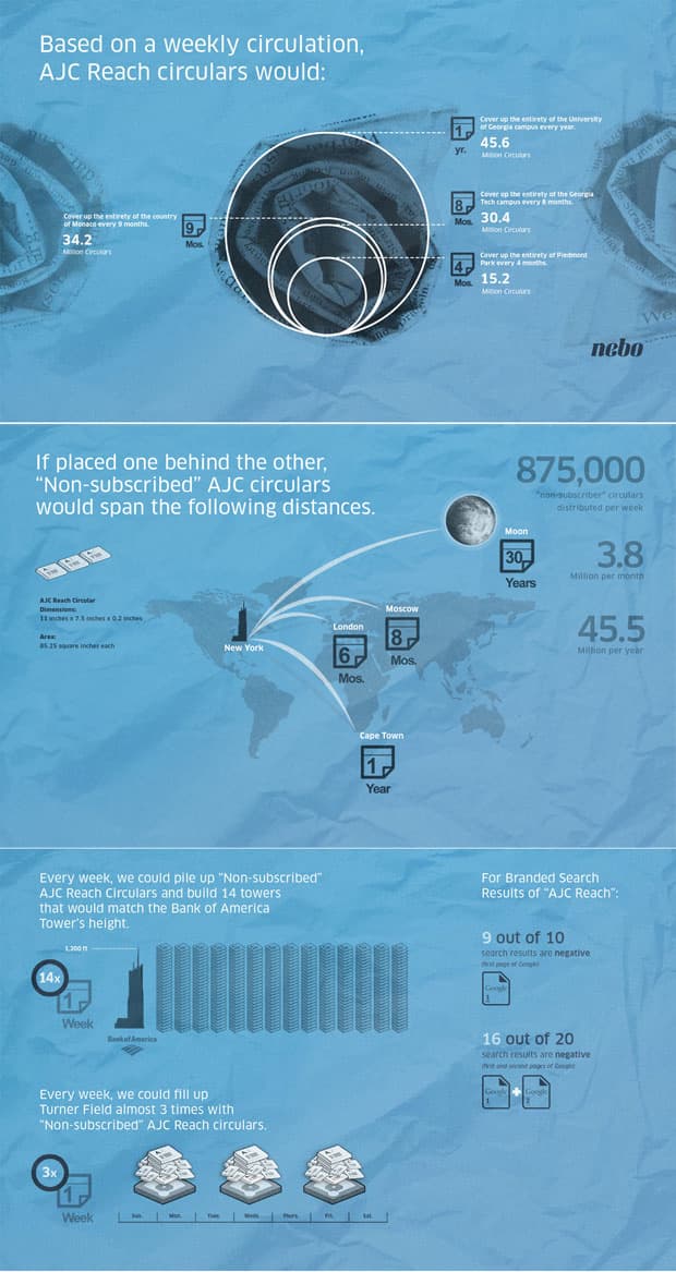 To play devil’s advocate for a moment, the business case for the AJC Reach would go as follows. In Atlanta, the AJC Reach claims to deliver to 1 million metro Atlanta households – 216,000 through their Sunday newspaper, and 875,000 through “household delivery.” Their sponsorship rates to reach 1 million people range from $1,600 to $4,800 for one interior placement, to about $18,000 for one exterior placement. That’s a lot of money to be made for so many ads every week.