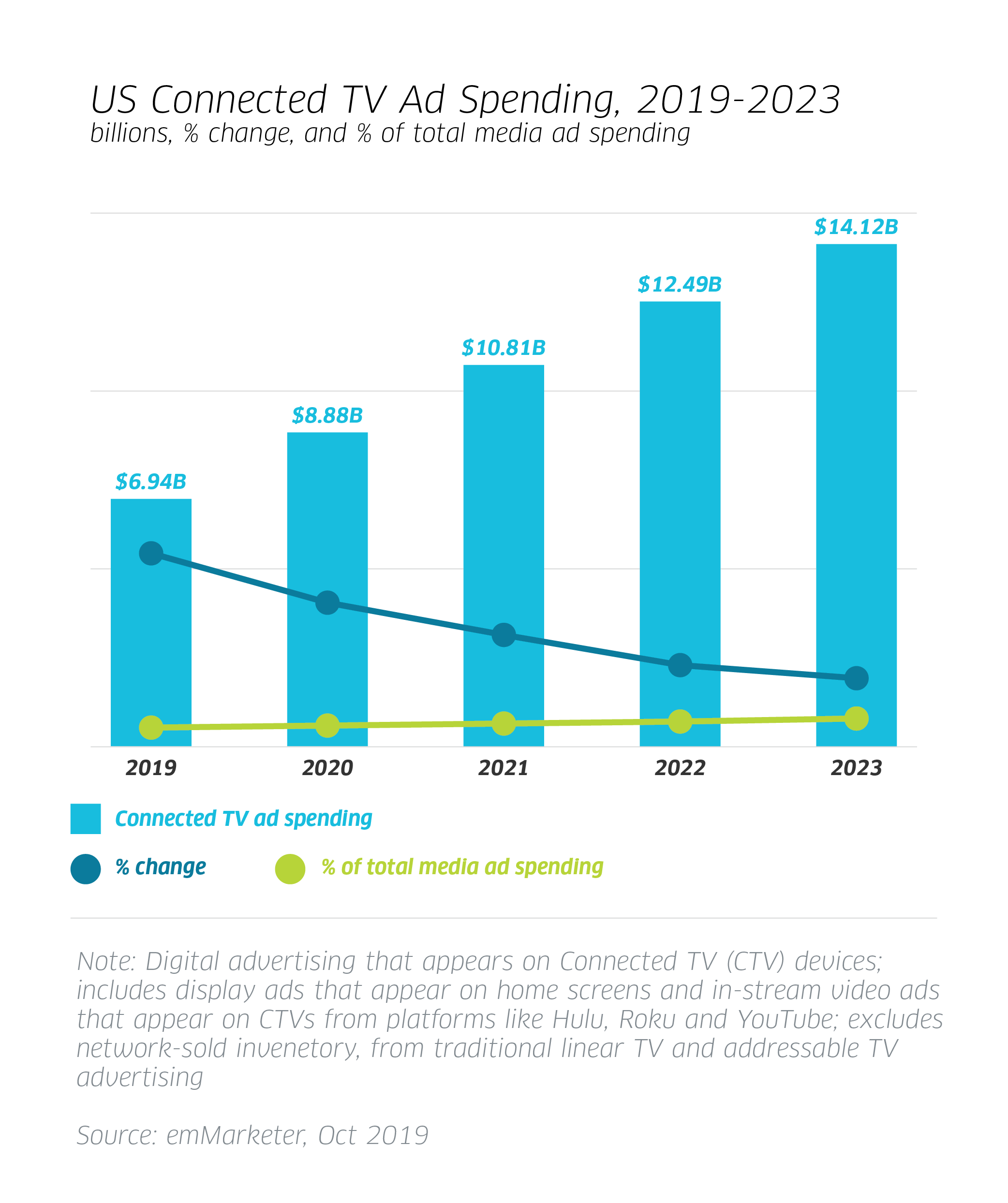 As if the TV landscape weren’t evolving fast enough, along comes advanced TV. These connected TVs, or CTVs, give brands a new medium through which to grow their audience. The number of users opting to stream via smart TVs and devices continues to grow year after year. Emarketer estimates that U.S. advertisers will spend some $7 billion on CTV ads in 2020. By 2023, that number is projected to reach about $14.12 billion.
