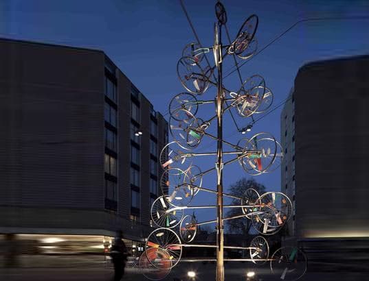 4. Recycled Bike Wheel Tree: London strikes again with yet another amazing Christmas tree concept. Displayed in Bermondsey Square in London, this tree is made out of 35 old bike wheels. It was designed by Sarah Wigglesworth Architects with wheels borrowed from the U.K. charity, Re-Cycle, which collects recyclable parts to restore old bicycles to ship to Africa. [Image]