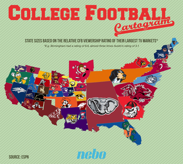 Being based out of the South, Nebo’s office is full of fierce college football loyalty. It seems to be a point of some confusion for those coming from other parts of the country. If you don’t understand the scale of college football fanaticism in the South as it relates to other parts of the country, maybe we can help you out with one of our favorite things in the world: analytics.