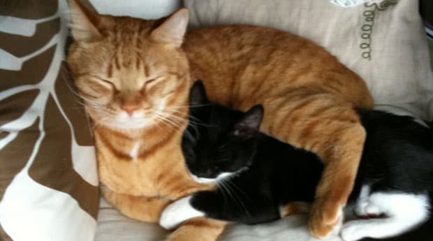 Adam climbed up and rescued the starving and flea ridden little kitten. He and his wife nursed him back to health and gave him a home. Now Bandito spends his days playing with his fellow kitty, Nakata (the orange tabby pictured above), getting dressed in ridiculous costumes by Adam’s wife, Alison, and enjoying the warmth and love that comes with having a family.