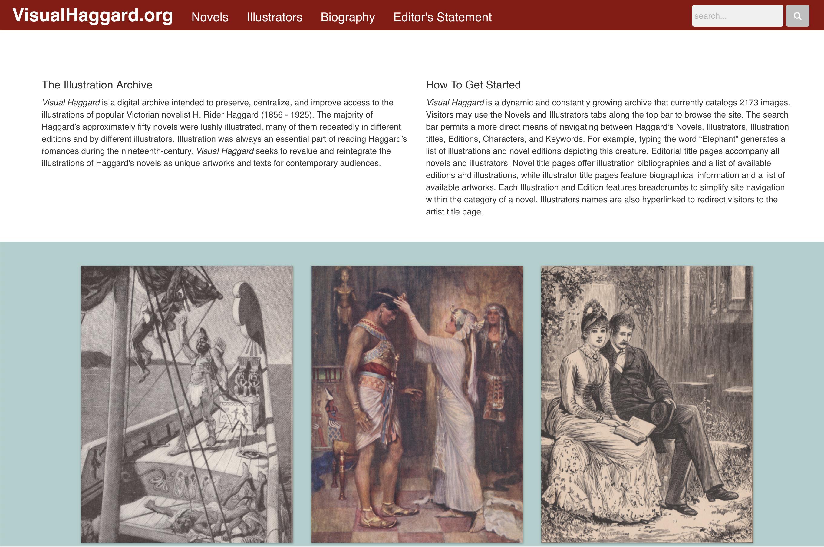 About six years ago I co-founded the digital archive visualhaggard.org with Joe Essey, a Ruby on Rails developer. Visual Haggard is a peer reviewed literary and art historical resource which contextualizes and improves access to over 2,000 illustrations created to accompany the novels of Victorian author H. Rider Haggard. Rider Haggard wrote over 50 novels in the adventure fiction genre, and he is responsible for inventing the Indiana Jones-style archaeologist adventurer in books like King Solomon’s Mines (1885) and She (1887). Although relatively obscure today, the majority of Haggard’s novels were lushly illustrated, many of them repeated in different editions and by different illustrators. Visual Haggard seeks to revalue the illustrations of Haggard's novels as unique artworks and texts for contemporary audiences by making them freely accessible online.