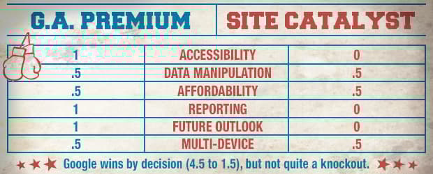 Once Premium incorporates visitor-based tracking, we anticipate them winning this round. Premium, as a newer product, has had the chance to learn from SiteCatalyst’s mistakes and logically would better be able to implement the same capabilities. That, combined with the usability of the Premium platform, makes us forecast Google coming out on top...eventually. For now, this round might be a draw.