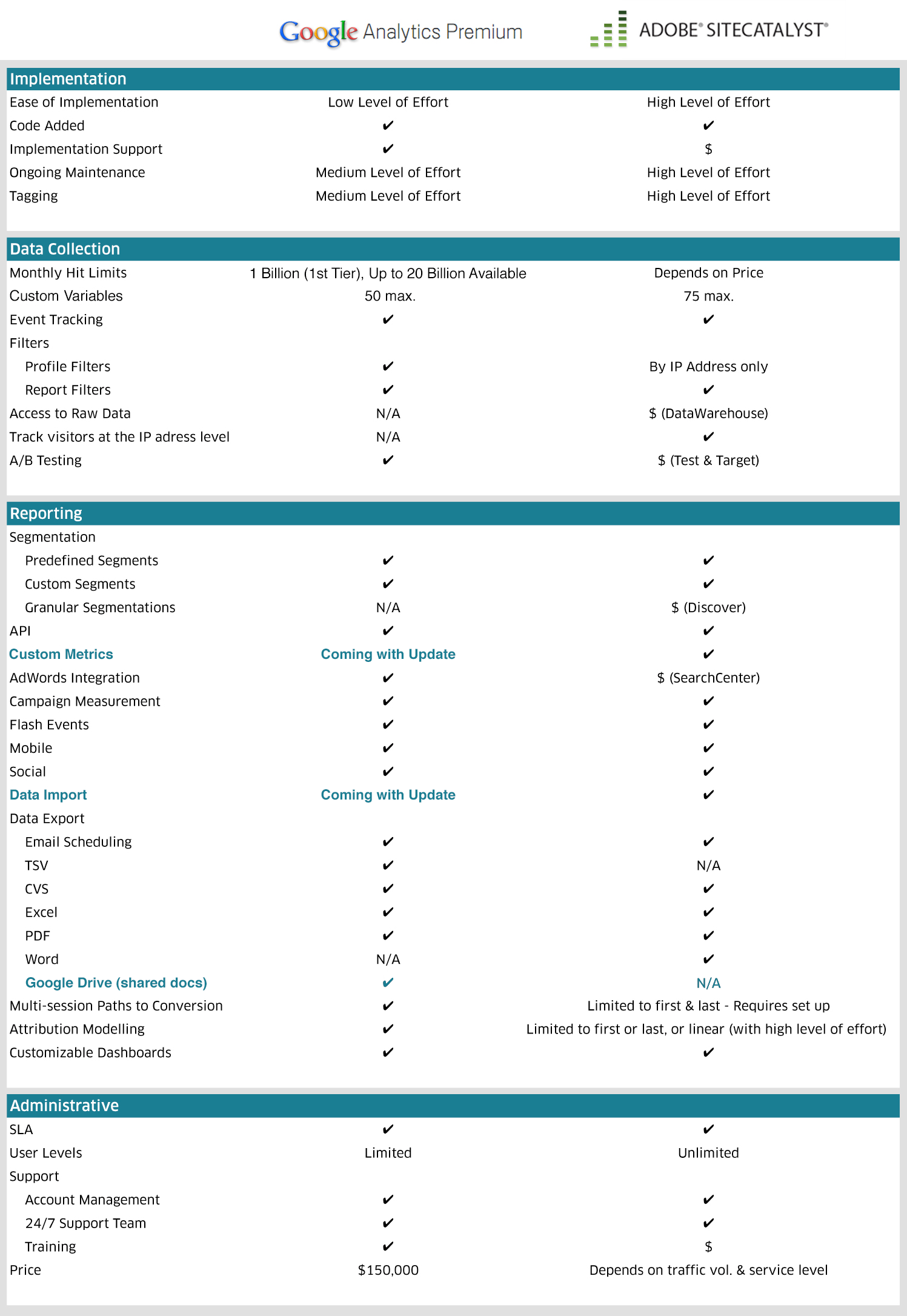Another interesting comparison. A few notes. SC has 250 custom variables. 75 sprops. 75 evars. 100 custom events. And as far as pricing goes I've seen Adobe contracts for under 50k.