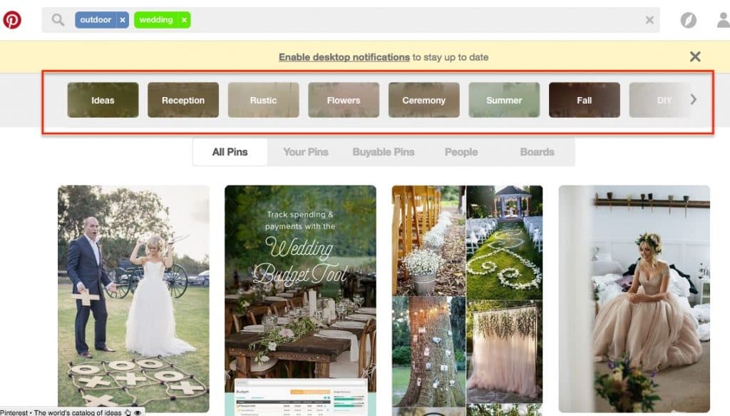 - Also, after you perform a search, Pinterest tells you the top categories users are looking for related to that search. They’re basically giving you keyword level data: