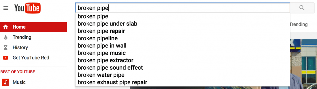 - Using YouTube Autocomplete will give you a basic idea of what people are searching for through the platform. For example, if you’re a plumber and want to know what video content is being searched, simply go to YouTube and type in something you know about to see the top questions around the subject.