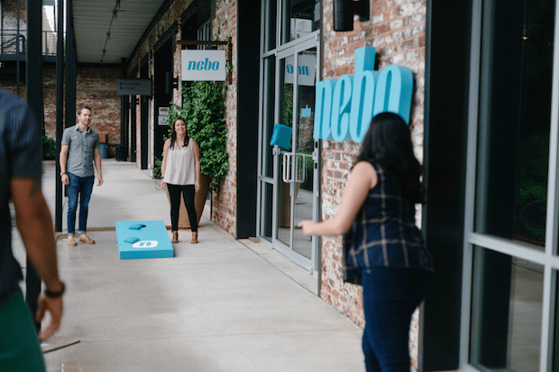 At Nebo, we have beer(!) and dogs (lots and lots of dogs). We even have a picture in our pitch decks of folks playing corn hole and another of us doing volunteer work.