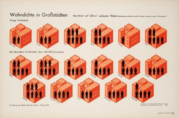 Neurath’s pictorial language caught on very quickly. Newspapers across the world were soon creating their own Isotypes to share quantitative information, as were New Deal thinkers and designers in the US. Around 1931, Neurath partnered with the Mundaneum to promote his work internationally. Soon, branches of his design studio were forming in Berlin, The Hague, London and New York. Members of the Vienna team traveled periodically to the Soviet Union to produce statistical graphics. Neurath began writing and publishing books on the Isotypes and creating a set of best practices.