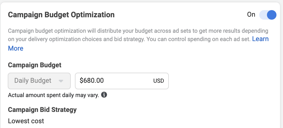 - Daily Budget: The average amount your campaign will spend each day, best for when you have specific daily spend goals