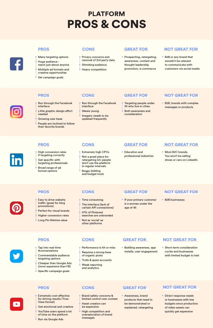 This deep dive on pros and cons could go on for days due to the sheer number of social media platforms, but we’ll focus on the “Top Six” platforms.
