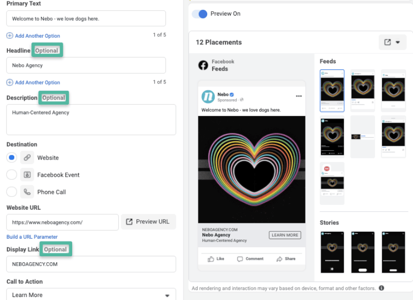 - Some ad aspects are indeed optional as they don't show up on all placements, but why not go ahead and manually enter them yourself to have more control of how the ad will appear.