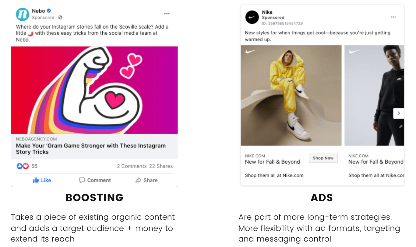 A fundamental aspect to understand about paid social is what is a Boosted Post versus an Ad? They both say ‘sponsored’ when on a feed, but what’s the difference?