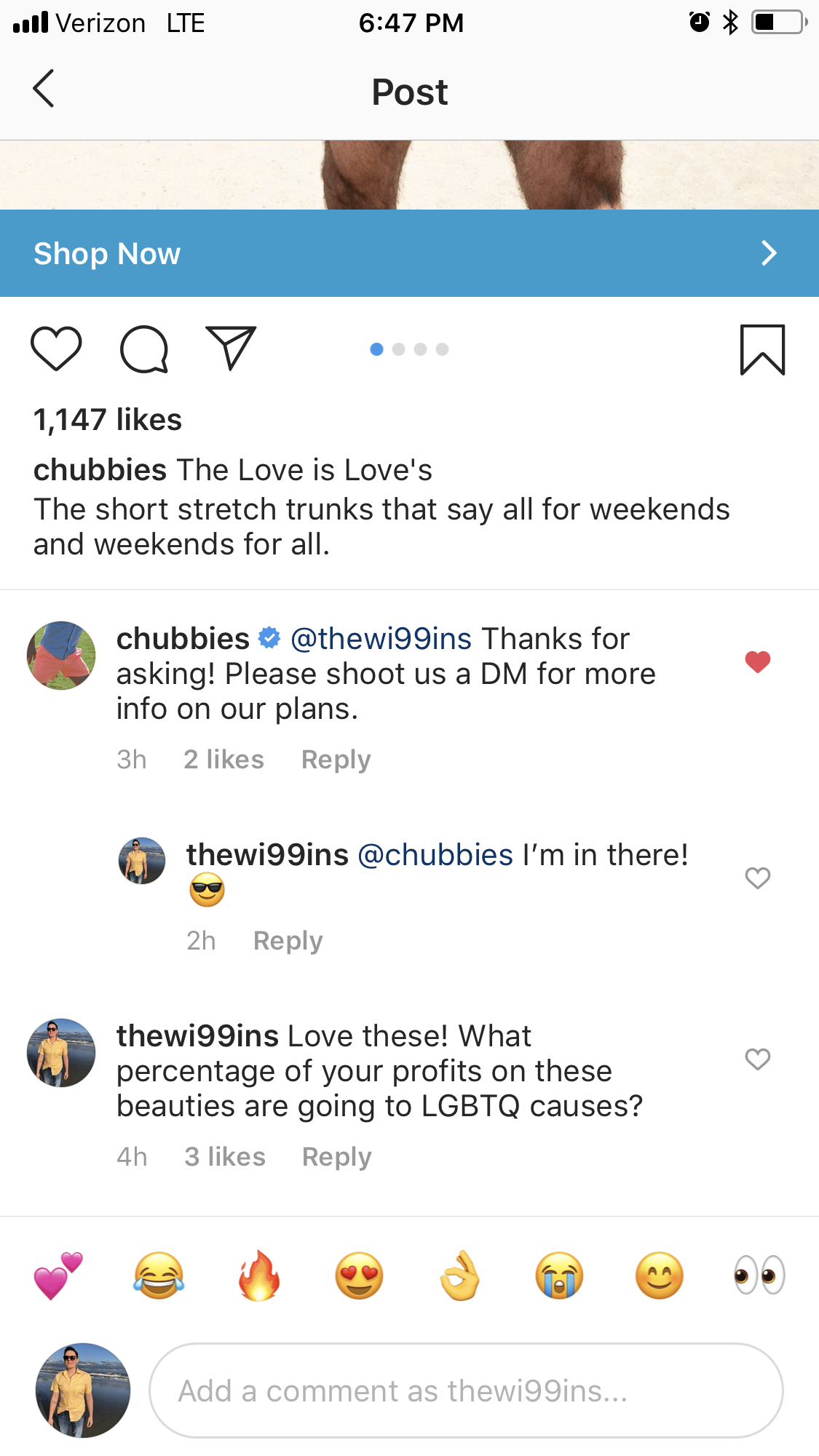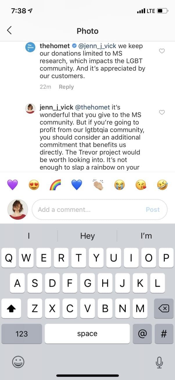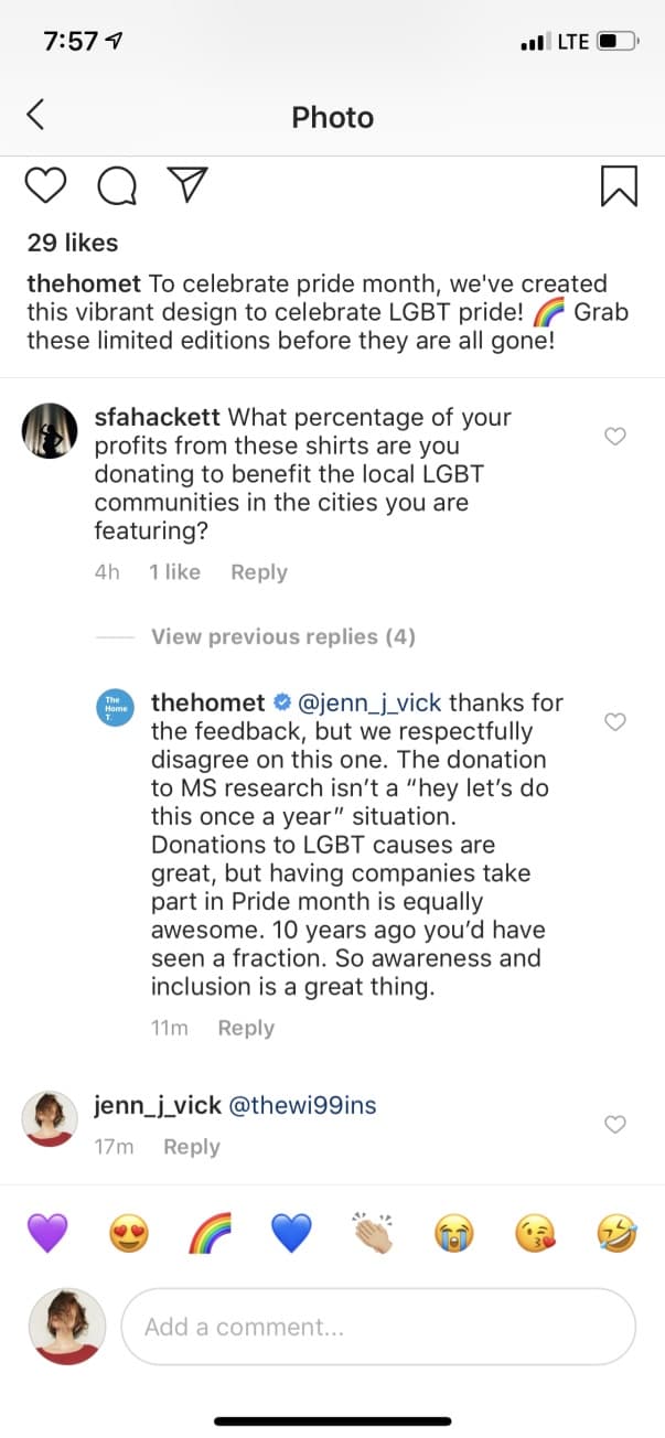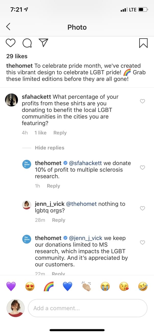 Unfortunately, but not surprisingly, I’ve experienced this first hand. As you can see from my inquiries into an ad I was served on Instagram, it happens with smaller brands hawking graphic T-shirts. Before the comments were deleted, @thehomet dismissed my concern by resting on the laurels of donating to a core cause.