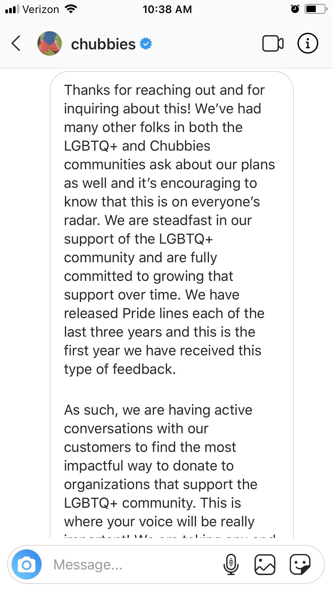The next example was particularly hard for my partner, as it resulted in her breaking up with @chubbies. You can tell they are very cautious about their community management, but when she DM’d, they gave her the ol’ canned ‘thanks for your feedback’ song and dance.