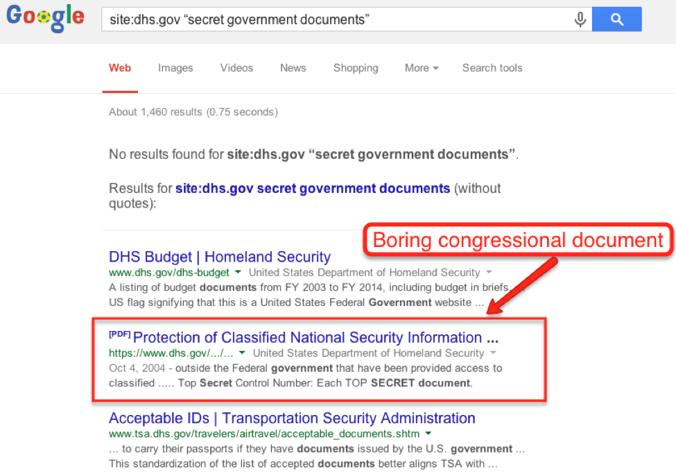 First, we’ll make an educated guess that the Department of Homeland Security will have some interesting documents, so we’ll use the query site:dhs.gov “secret government documents” to start.
