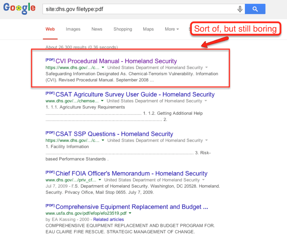 And all these results are just from the site:dhs.gov website. Change the site: operator to dod.gov (the home of the US Department of Defense) and search for: