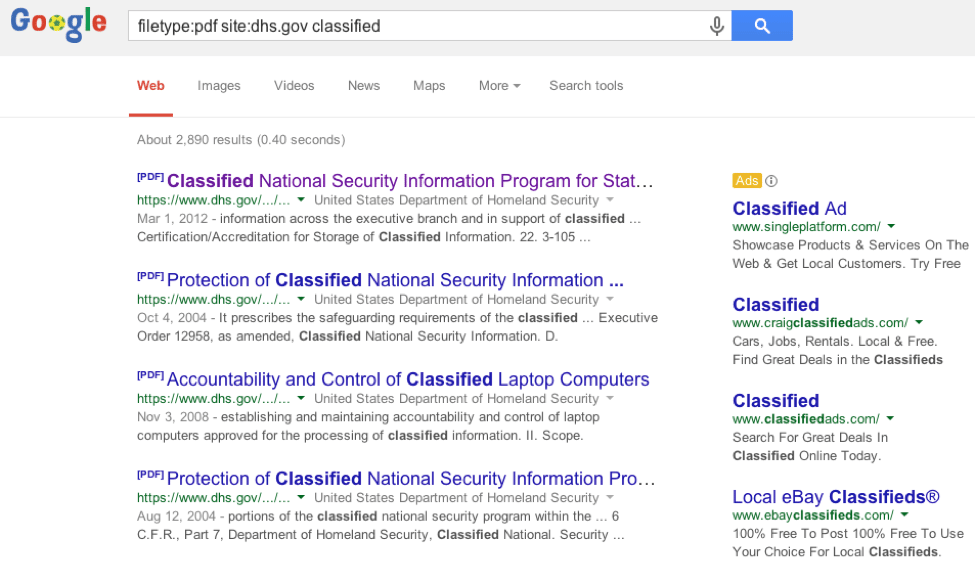 Getting closer - we now only have 2,890 documents to sift. But note how Google understands “classified” to be an adjective rather than a document type. It’s a subtle difference, but still key.