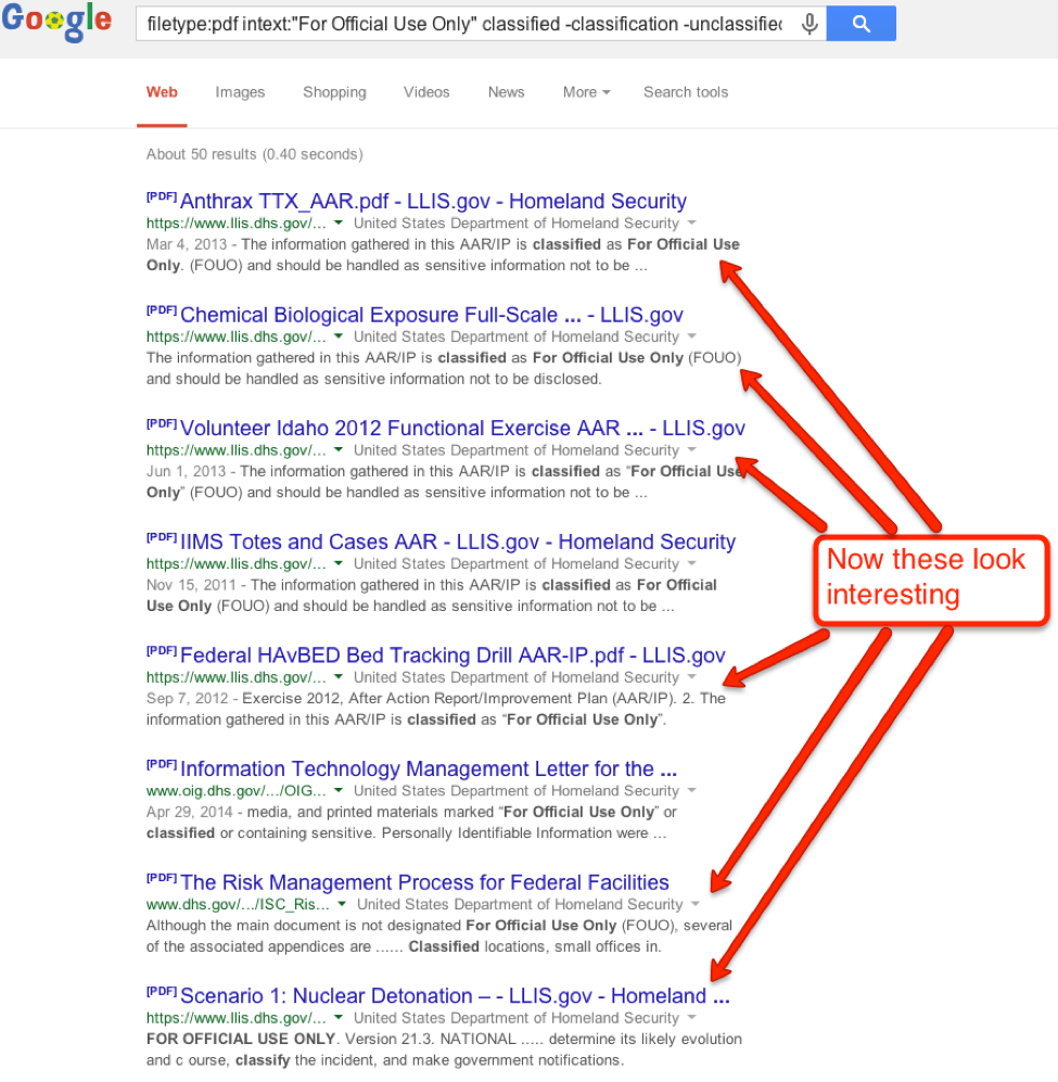 Add all that up and we have our final query - filetype:pdf intext:"For Official Use Only" classified -classification -unclassified site:dhs.gov to plug into Google.