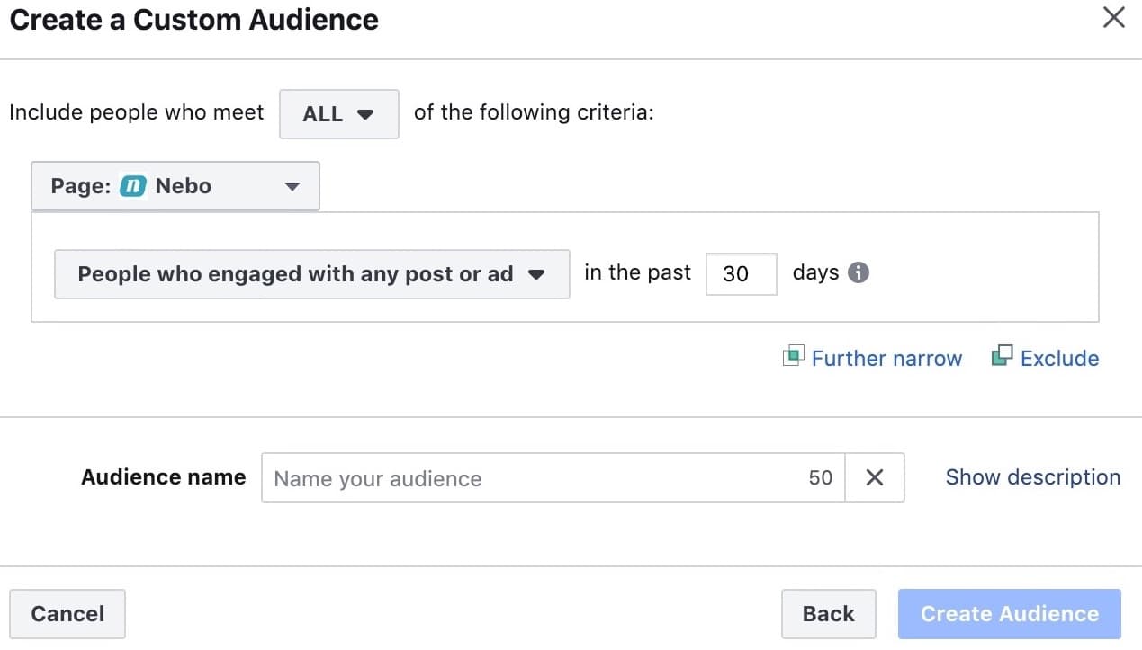 To make the most out of custom audiences, you want to be sure that your “custom audience” aligns with your campaign goals, and also that you exclude the necessary audiences. For example, if your campaign goal is to drive engagements, you would probably want to create a custom audience from past engagers, because these are the people who have proven to engage with your site in the past and will likely do so in the future. Whereas, if your goal was to drive sales, you may want to create a custom audience off of people who went to your site, added something to their cart, but didn't purchase anything because this means that they are likely interested and/or close to making a purchase.