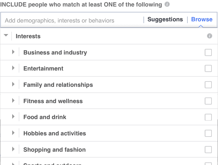 By starting out targeting a wide range of interests, you allow Facebook to collect enough data to understand what’s working and what’s not. As your campaigns run, it will get better at knowing who exactly to show your ads to. Starting out with a wide range of interests is also smart for this type of targeting, because you never know how different types of interests will correlate with one another to produce better results.
