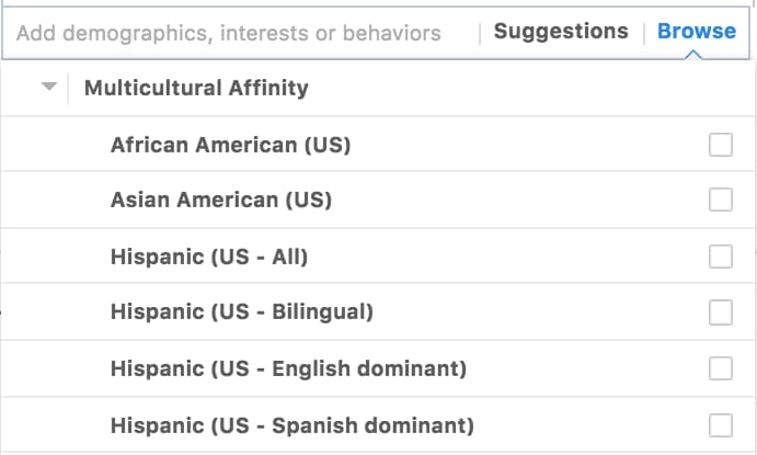 - Using the Multicultural Affinity Category as a way to exclude people is no longer allowed: The multicultural affinity category still exists as a targeting option, however Facebook has removed the option to use this category as a way of excluding people. Essentially, this is Facebook's way of taking a stance against discrimination and not allowing advertisers to discriminate against certain nationalities.