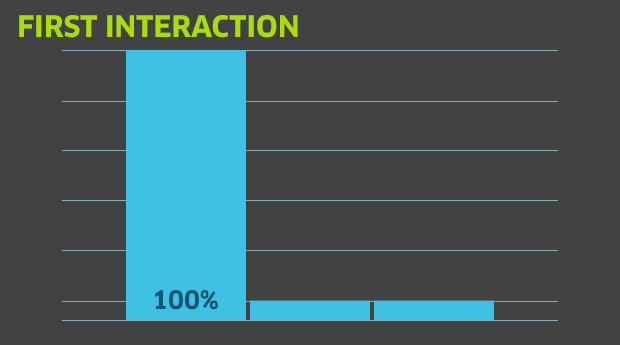 First Interaction modeling gives 100% of the credit to the first interaction. In this case, that would be the organic search query. This can make sense, as it was the first touch point that drove brand awareness. However, it discredits any future marketing efforts. In my opinion, this model doesn’t give enough credit to secondary touch points, which can ultimately drive that potential customer to become an actual customer.