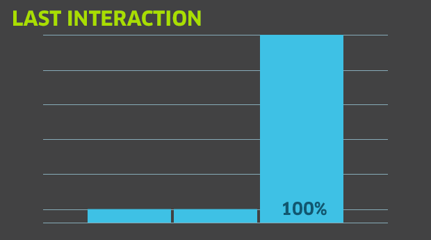 Last Interaction modeling gives 100% of the credit to the last interaction prior to conversion. In our example, that would be email marketing. Personally, this is my least favorite model, but it can make sense in that it WAS the last thing that someone did prior to converting. So, you could make the case that the last interaction was the final driver to conversion.