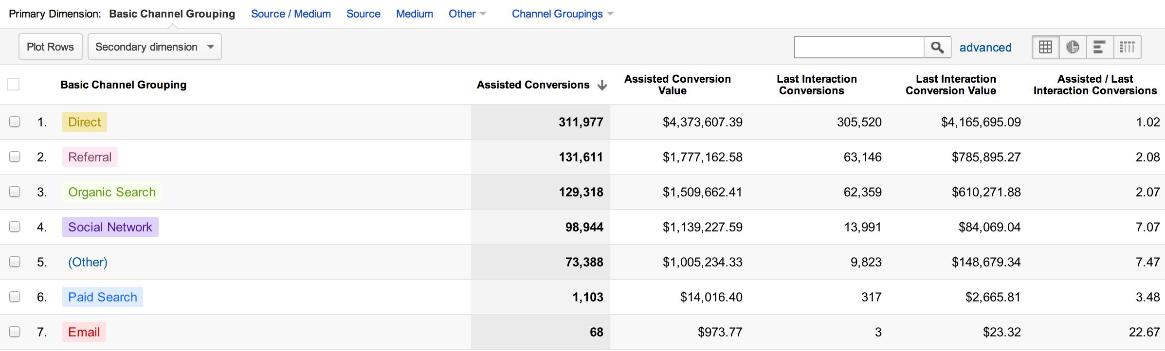 Assisted conversion value from Social Networks can be surprising, as seen here.[/caption]