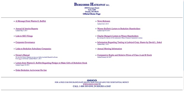 The concept of keeping a website intentionally under-designed isn’t new—just look at Craigslist. A minimalist approach to web design can be seen as directly in line with Berkshire Hathaway’s brand (if it has one). They are all about limiting expenses: they abhor flashiness; they have fewer than 30 corporate employees; they are headquartered in Omaha; and they would rather people focus on their assets than the holding company itself.