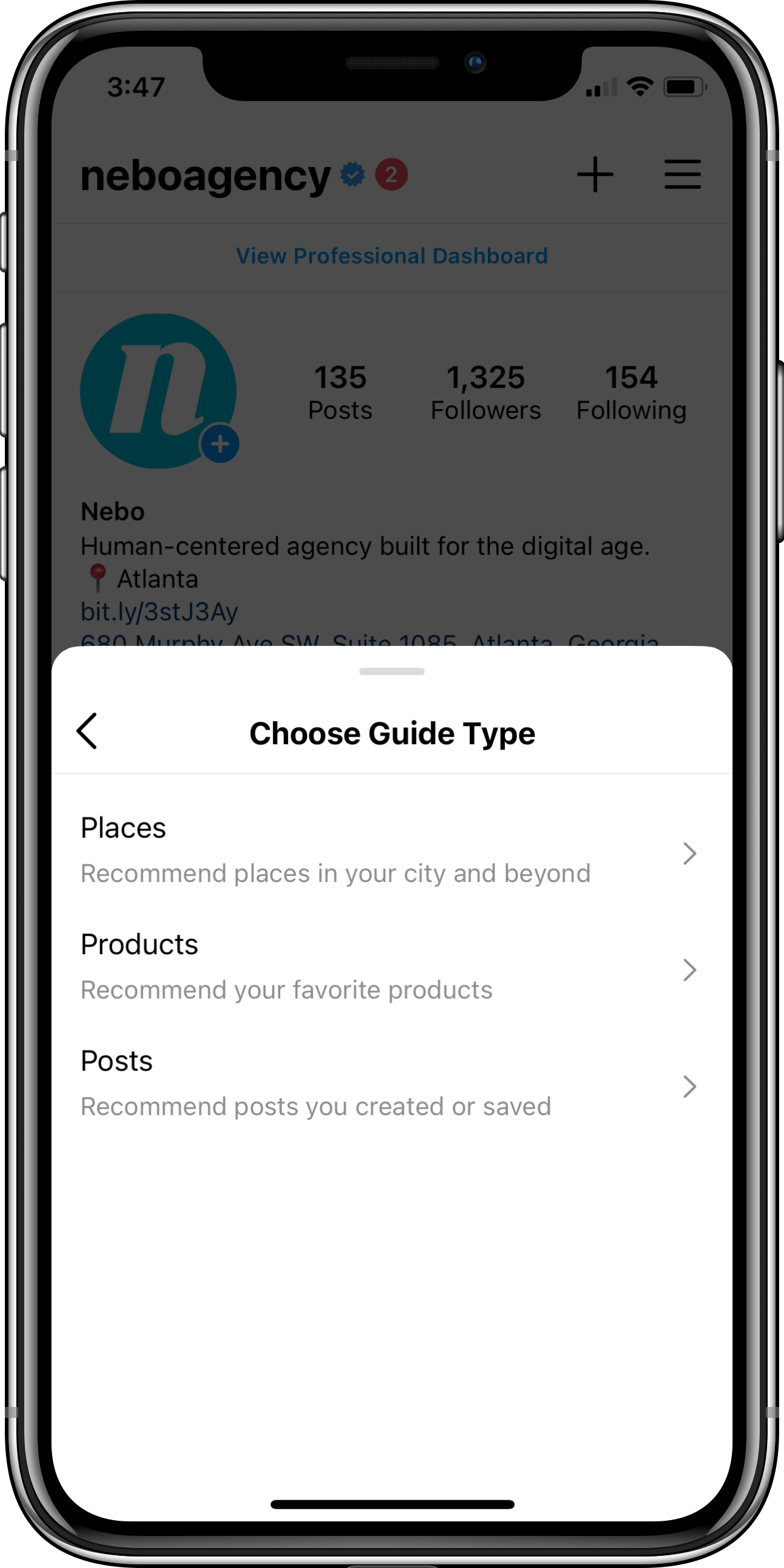 Once a Guide has been created, it will live on an Instagram profile as a separate tab between user’s posts and tagged posts. It’s lumped into the area where you will find IGTV videos or AR filters if that content has been posted on your Instagram account previously.