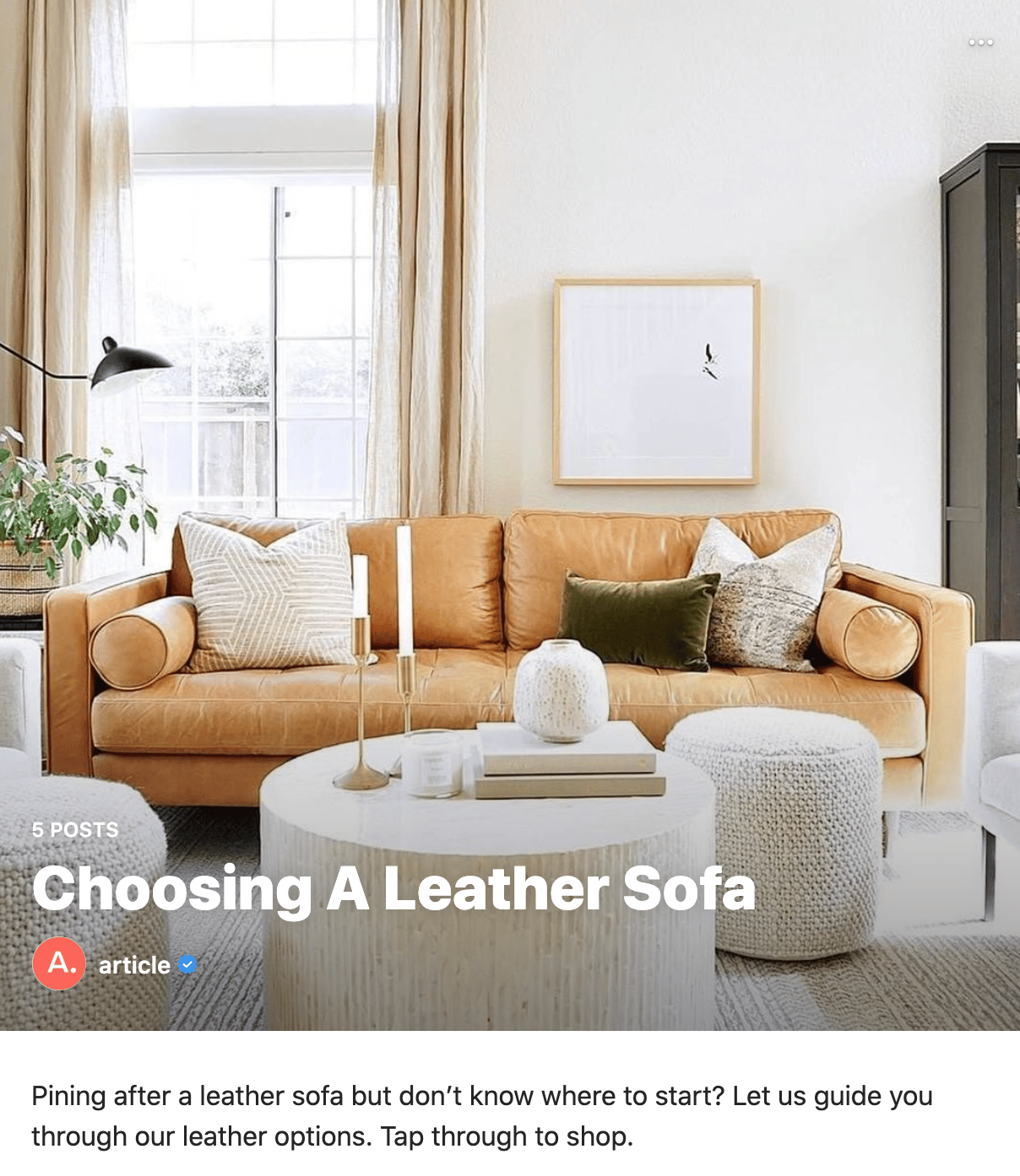 This Guide utilizes Article’s owned posts by showcasing different leather sofas. Throughout the Guide, the Article provides education on different features in each leather couch, while also providing major design inspiration for followers. ✨