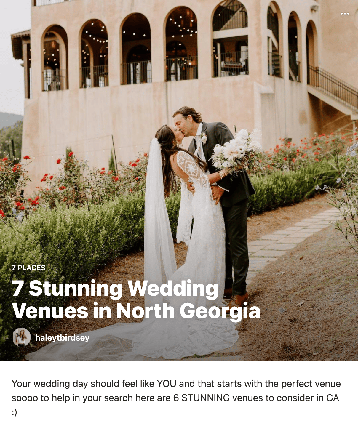 The next Guide comes from a local photographer, who I discovered during my own wedding planning adventures. It utilizes the “location” feature to show wedding venues with stunning imagery that was publicly tagged in each location by herself and other photographers. This Guide strongly caters to its audience by providing guidance to brides who are likely looking at both photographers and venues simultaneously. 💍