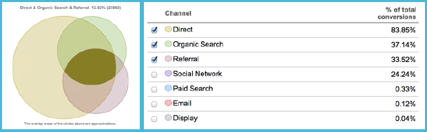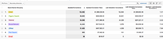 With multi-channel tracking, we begin to see a complex system of assisted conversions. Take, for instance, the chart below. At first glance it might appear as though social marketing is not worth an investment, as it only drove $34,000 in last click conversions. However, taking into account assisted conversions, you can see that social was actually a driving factor in 20 percent of revenue.