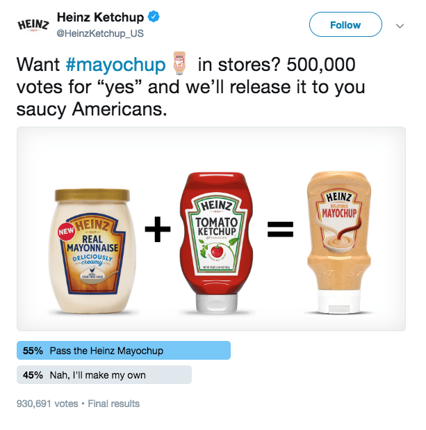 Not only is this an inexpensive way to do a focus group with the entire internet, this single tweet garnered 1 billion impressions in 48 hours. Not to mention all the free PR that is still streaming in as Heinz prepares to launch in select cities.