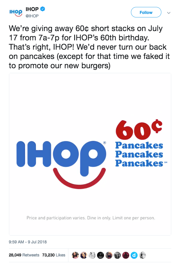 But IHOB worked! Burger sales quadrupled after IHOP became IHOB, and over 100 brands and celebrities joined in on the conversation, earning IHOP a total of 2.1 million social media conversations in the first 10 days from the launch of the campaign. And just in case you were worried that they got rid of pancakes, they went back to their roots once their point was made.