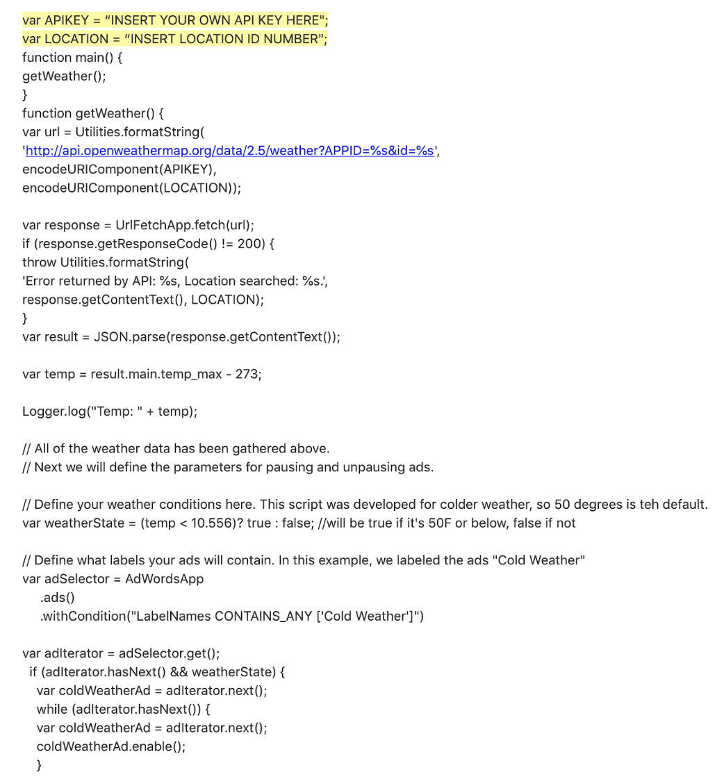 This script was developed to take our testing further. Instead of simply bidding up and down by weather as we had in the past, we wanted to alternate ad copy and launch specific weather-triggered campaigns. You can now use this same code to launch your very own weather-based copy testing.
