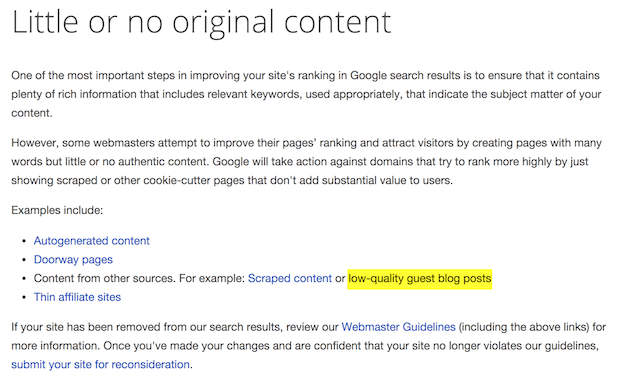 In addition to penalizing sites with links from blog networks, Google also quietly updated their Webmaster Guidelines to include “low-quality guest blog posts” as being a violation of the guidelines.