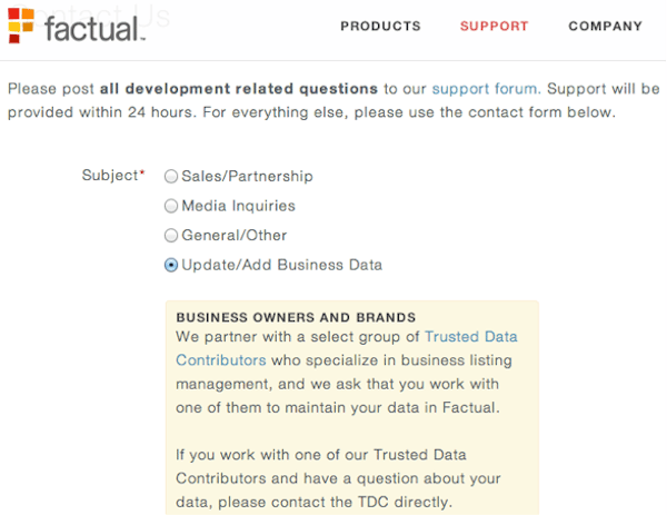 Factual, the local platform that feeds Apple products, is no longer accepting individual manual updates. When you select the option to Update/Add Business Data you're now asked to work with a Trusted Data Contributor. These Trusted Data Contributors include Text, Rio SEO and Moz, to name a few, and all require a small fee of course.