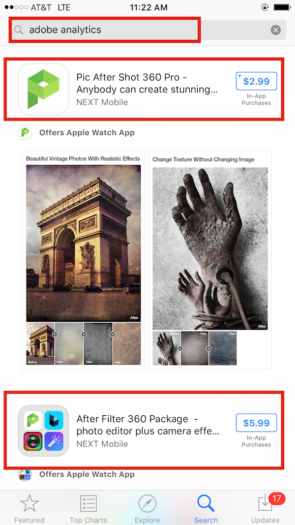 Searching for an app in app stores is a bit like searching on the web used to be. It’s basically a black box – you never know what you’re going to get. In fact, your search can be exceptionally specific and still not find what you’re looking for. For example, see what happens when I search for Adobe Analytics on the iTunes App Store.
