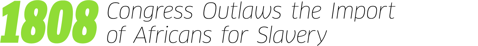 In 1808, Congress passed the act which “prohibits the importation of slaves into any port or place within the jurisdiction of the United States…from any foreign kingdom, place, or country.” Read more.