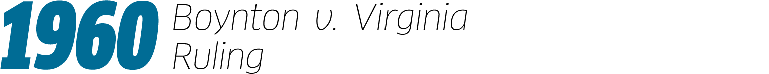 The 1960 ruling of Boynton v. Virginia declared the segregation of interstate travel such as bus terminals, restrooms, and other facilities unconstitutional. Read more.