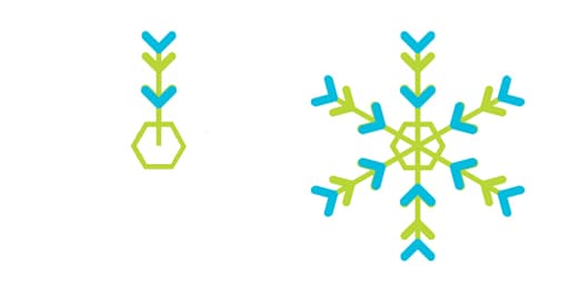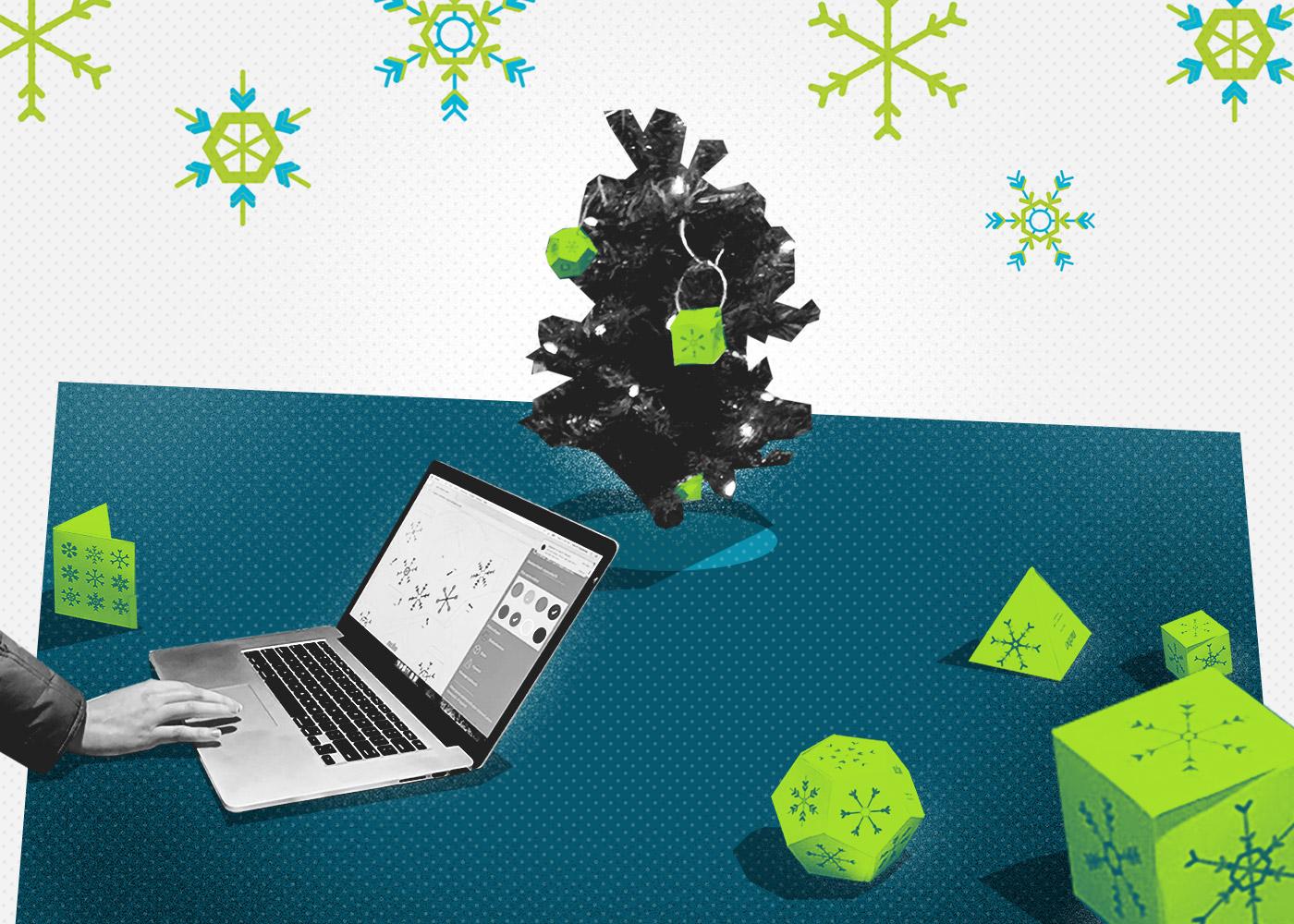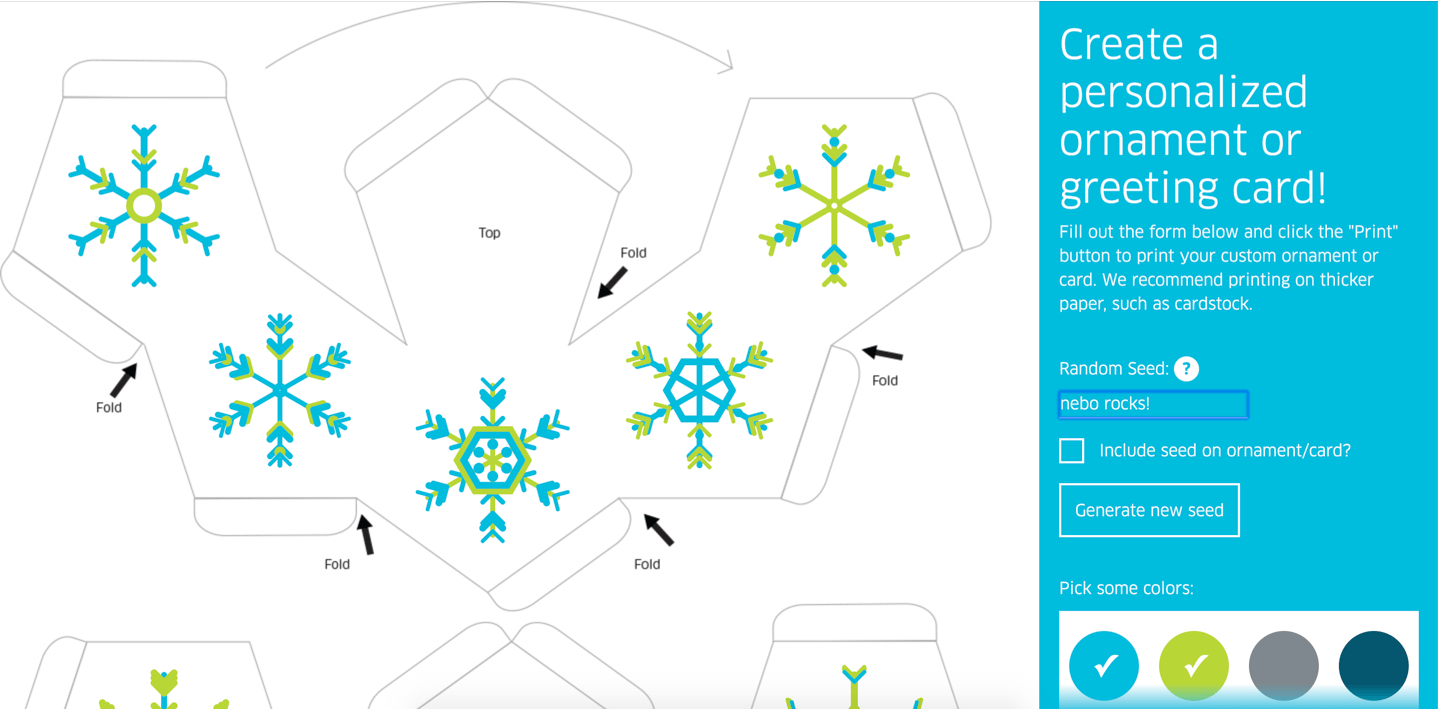 In the case of this application, we wanted to be able to provide a seed to the code to produce unique snowflake combinations based on the entered value. For instance, entering your own name as the seed produces a piece of art that is unique to your name, adding an interesting aspect of personalization to the project.