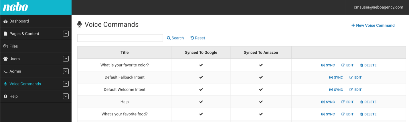 Once a particular voice command is defined, it is automatically synced to any service (Google or Amazon) that is configured in the CMS. Updates can be seen on the Alexa Skill and Google Action as soon as the data is published, which means that users will always see the latest version of your content and will see the same content regardless of their voice platform!